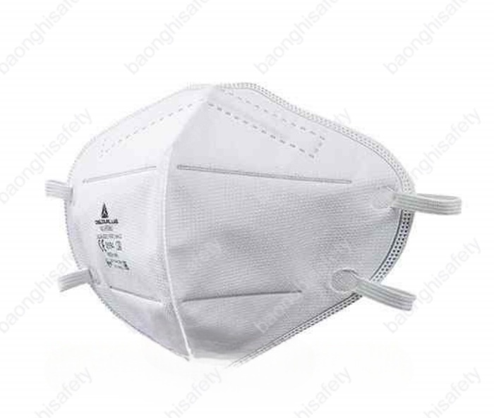 - Khẩu trang Delta Plus - Pháp được làm từ chất liệu sợi vải tổng hợp không dệt. Sản phẩm có mức độ lọc bụi là FFP1, hiệu suất lọc lên tới 95% bụi mịn có kích thước siêu nhỏ, vi khuẩn, virus, khí bẩn độc hại từ môi trường bên ngoài. Có dây đeo bằng cao su.