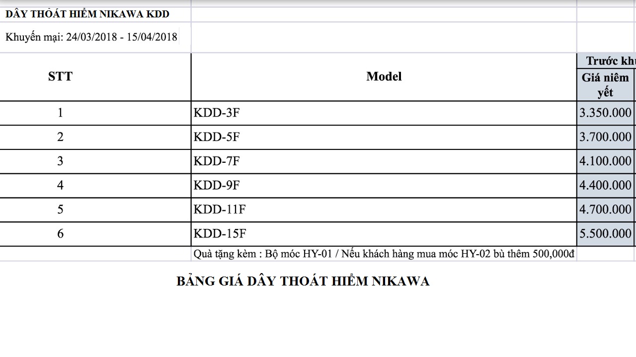BẢNG GIÁ SẢN PHẨM DÂY THOÁT HIỂM NIKAWA TƯƠNG ỨNG