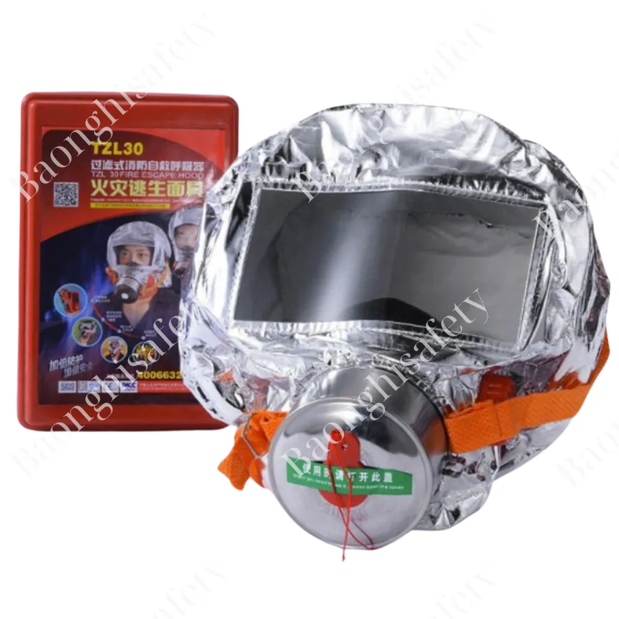- Phần đầu mặt nạ làm bằng vật liệu chống cháy, bên ngoài phủ lớp màng bạc nhôm để ngăn sự bức xạ nhiệt cao, tránh gây tổn thương vùng đầu cho người đang thoát hiểm. Ngoài ra, cửa sổ nhìn trong suốt, rộng đủ tầm quan sát để chạy thoát thân